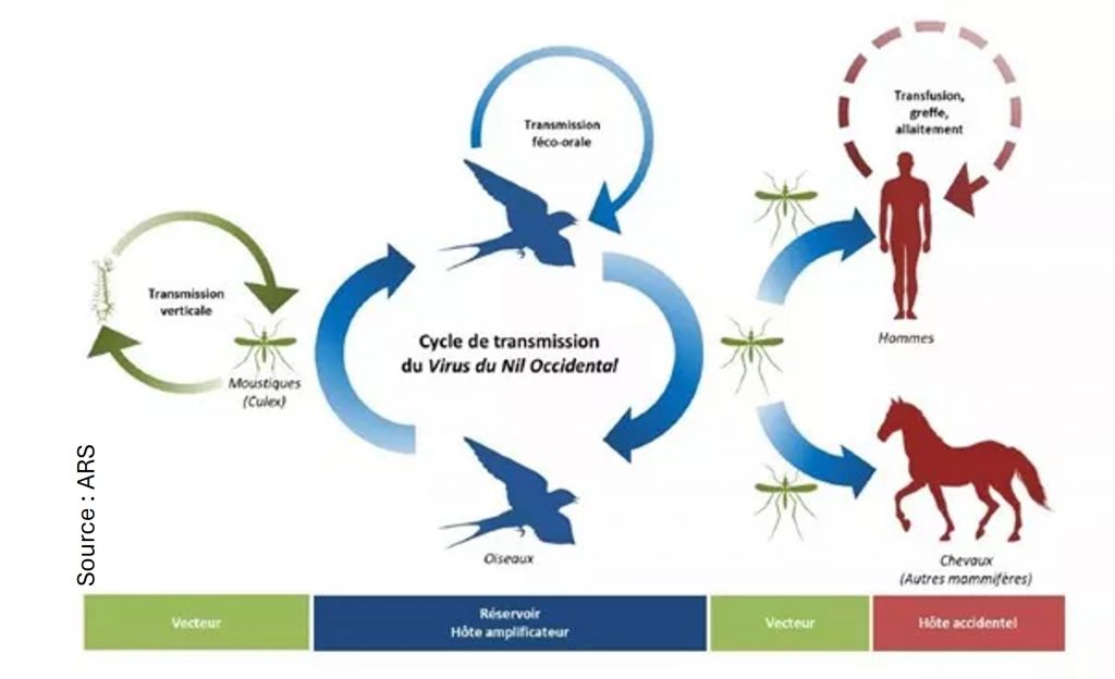 Le virus du Nil occidental, est transmis principalement par les moustiques du genre Culex. Ceux-ci sont porteurs du virus après avoir piqué un oiseau infecté. Les moustiques peuvent transmettre le virus aux humains et aux constituent alors des culs-de-sac épidémiologiques : les moustiques ne peuvent pas devenir porteurs après avoir piqué un mammifère infecté.